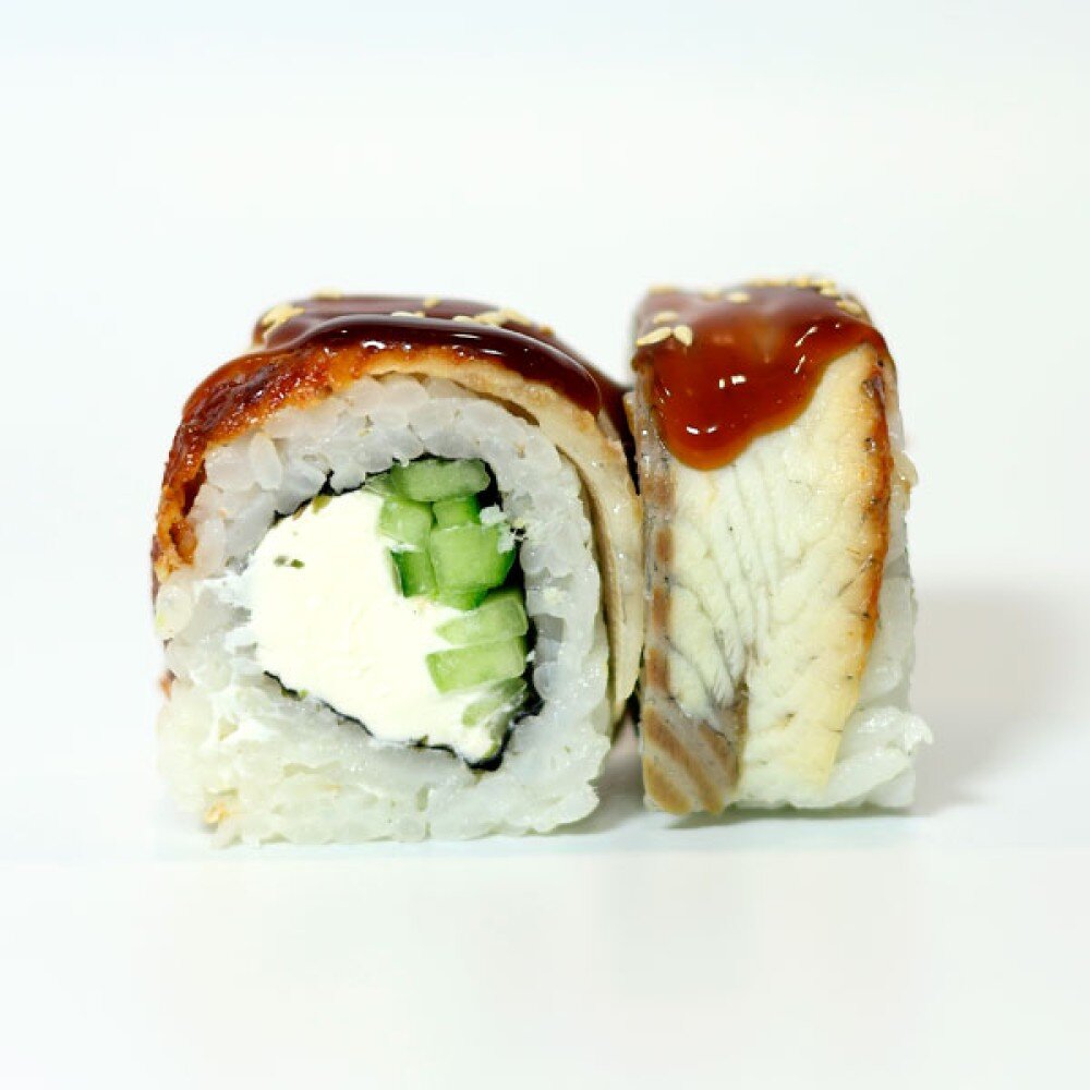Рис, нори, сливочный сыр, такуан, угорь, унаги соус, кунжут