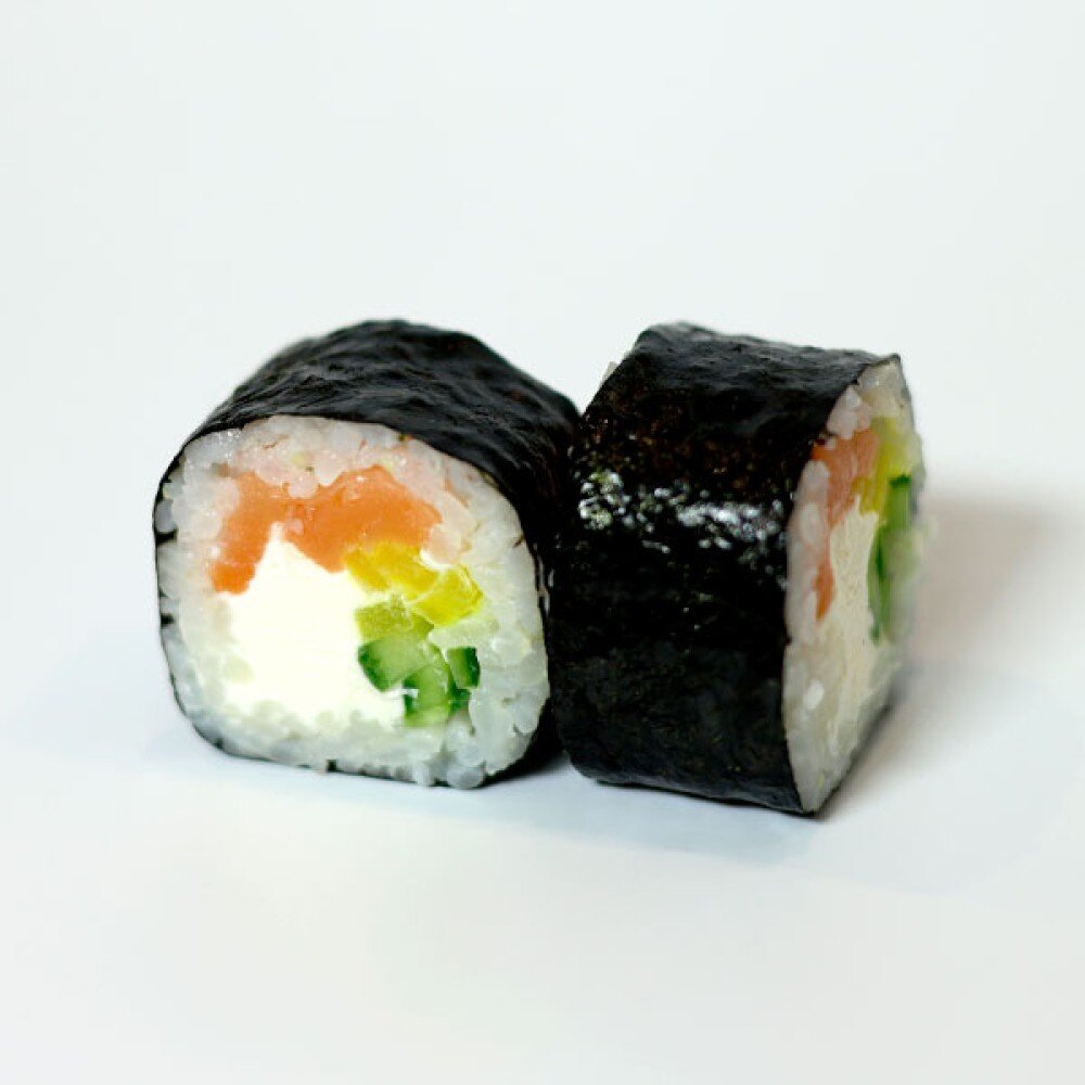 Рис, нори, сливочный сыр, норвежский лосось, огурцы, такуан