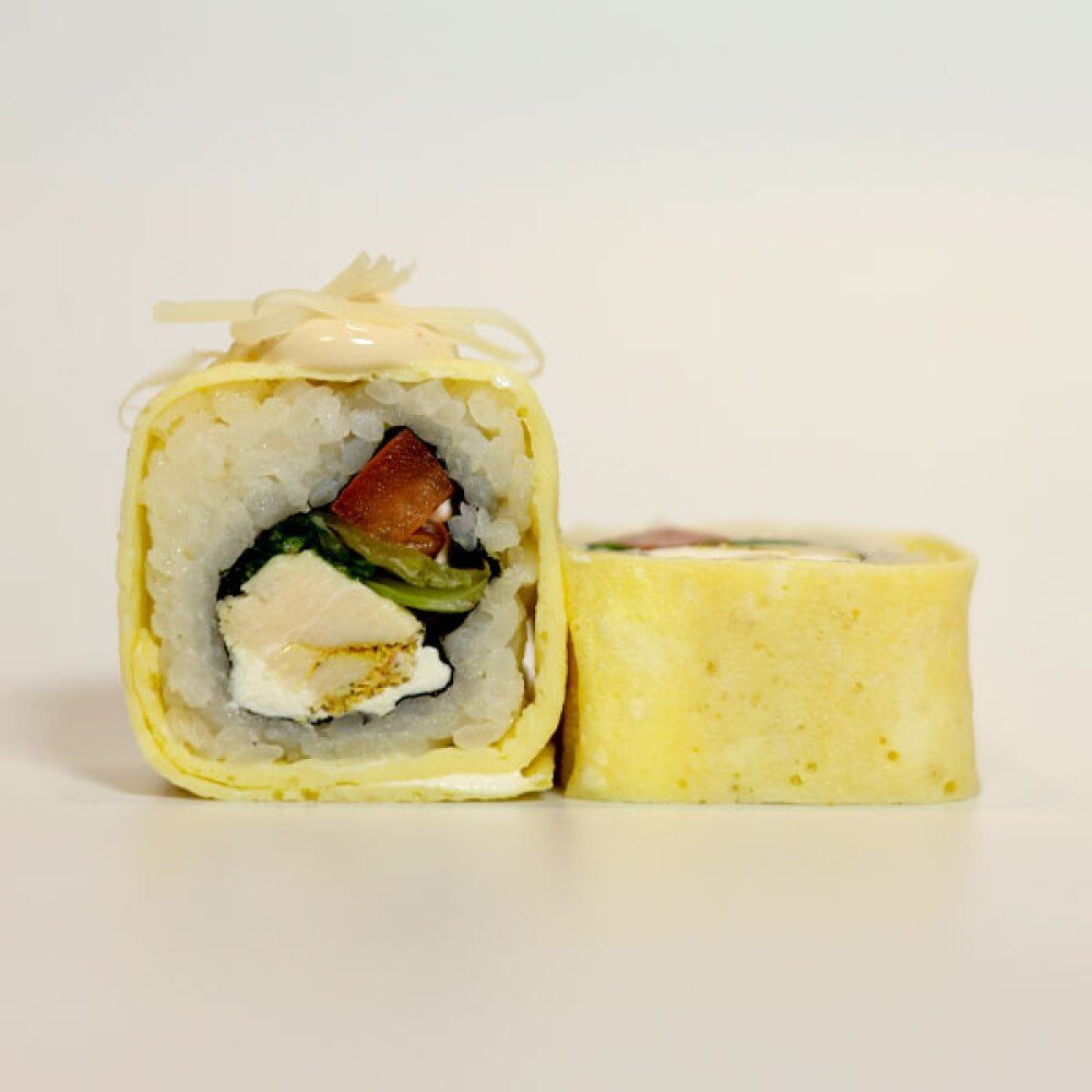 Рис, нори, сливочный сыр, цезарь соус, помидоры, салат айсберг, филе курицы, блинчик чакин, сыр пармезан